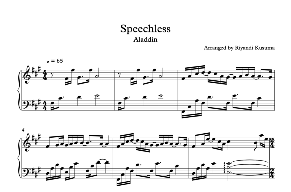 Aladdin - Speechless (Sheet Music)$5.99$5.99https://schema.org/InStockusdRiyandi KusumaRiyandi Kusuma4 ratingsI want this!Size92.9 KBLength5 pagesAdd to wishlist New wishlistShareShare on XShare on Facebook Copy linkCopy product URLRatings5(4 ratings)455 stars100%4 stars0%3 stars0%2 stars0%1 star0%